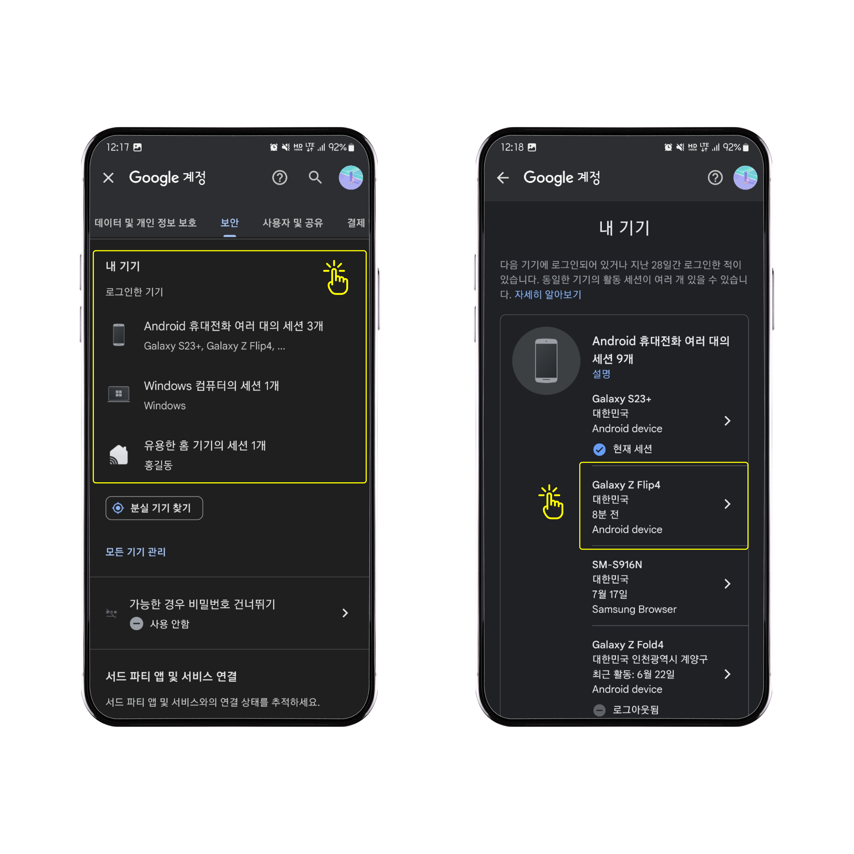7. 현재 사용하는 기기 이외에 로그인 기록은 로그아웃합니다.