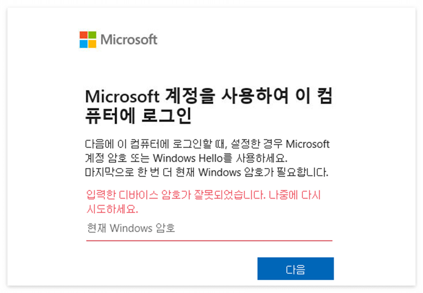 암호를 입력하려는 데 계속 현재 윈도우 암호를 입력하라는 문구가 떠서